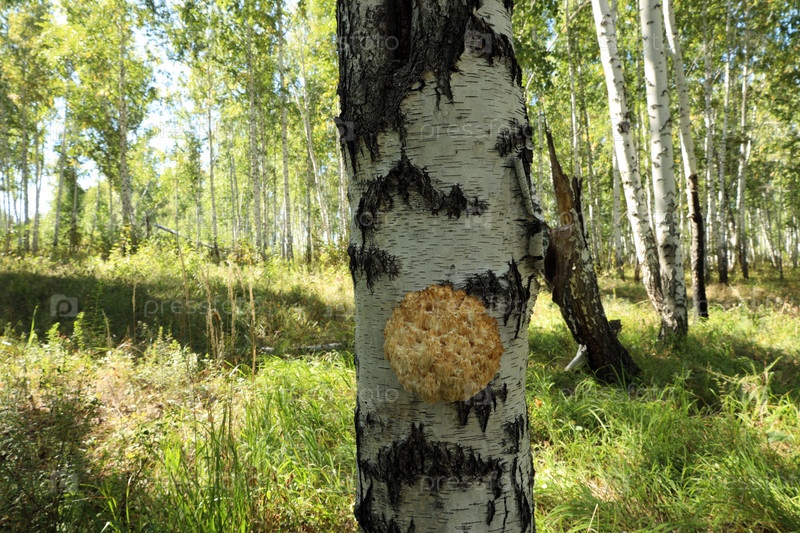 В летнем березовом лесу на дереве растет желтый гребенчатый еж (лат