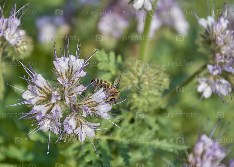 Медоносная пчела на фиолетовом цвете фацелии