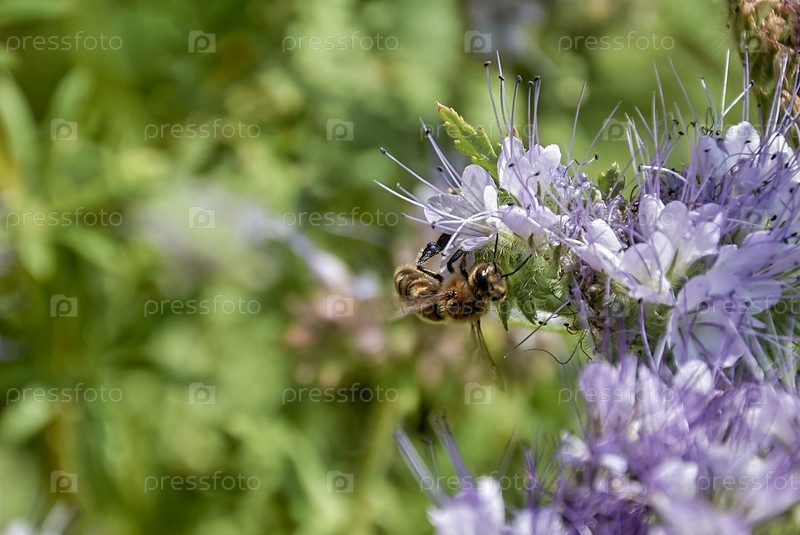 Медоносная пчела на фиолетовом цвете фацелии