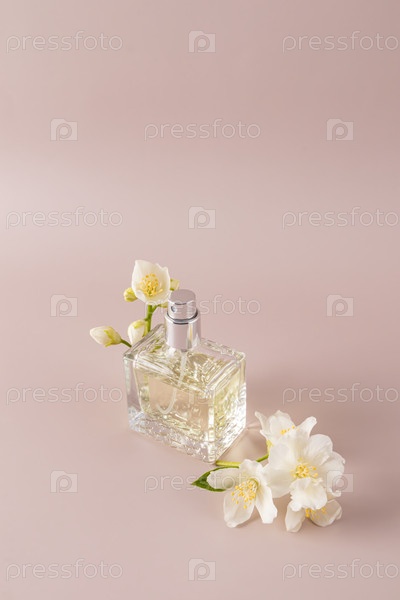 Прозрачный косметический спрей или парфюмерная бутылка с вкусом нежного жасмина на вертикальном каменном фоне. Копировочное пространство. Презентация ароматов