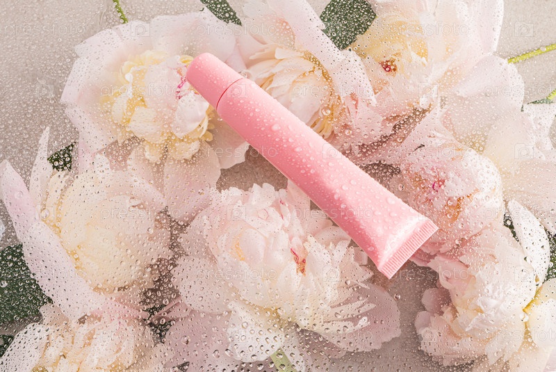 Розовая пластиковая трубка с увлажняющим бальзамом, блеском для губ, маской по уходу за губами лежит на шикарном фоне с пиониками и каплями воды. пустой пакет