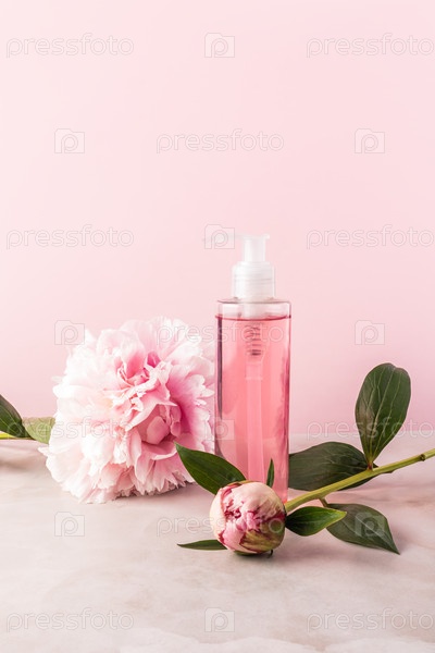 Косметическая прозрачная упаковка диспансер для бутылок мягких продуктов для спа-процедур. Розовый вертикальный фон с живыми пиониками. Копировальное пространство