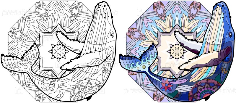 Рисование кита для антистрессовой окраски. цвет и контур ванны