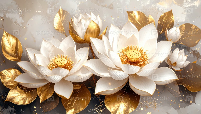 Художественная иллюстрация золотых и белых цветов лотоса, символизирующих чистоту, красоту, роскошь и духовность в современном декоративном стиле