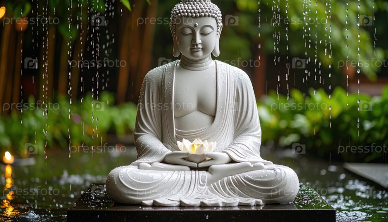 Спокойная статуя Будды, держащей цветок лотоса в тихом саду во время дождя, зажигает мир и просветление