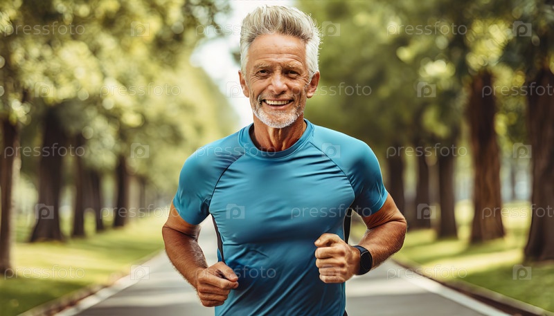 Пожилой мужчина бежит в пышном парке, надел синюю спортивную футболку и улыбается при ярком дневном свете
