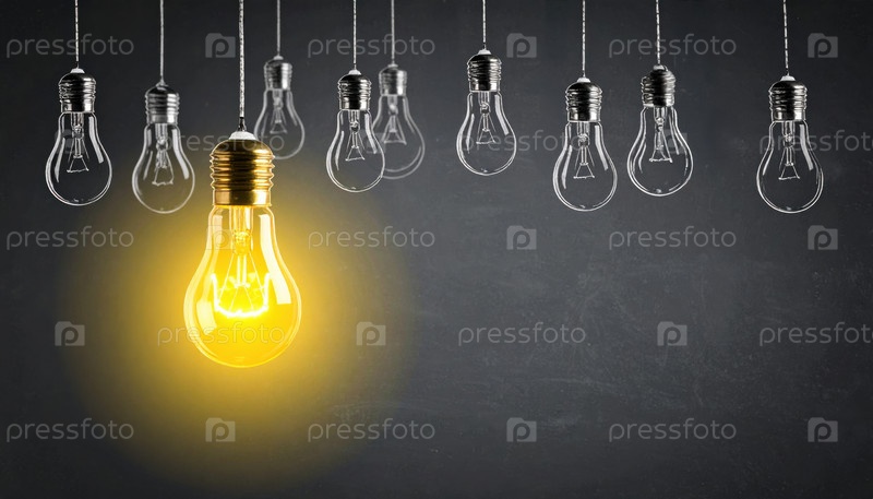 Светящаяся лампочка среди тусклых, висящих в ряд, символизирует инновации, прорывную идею, лидерство или концепцию мышления по-другому