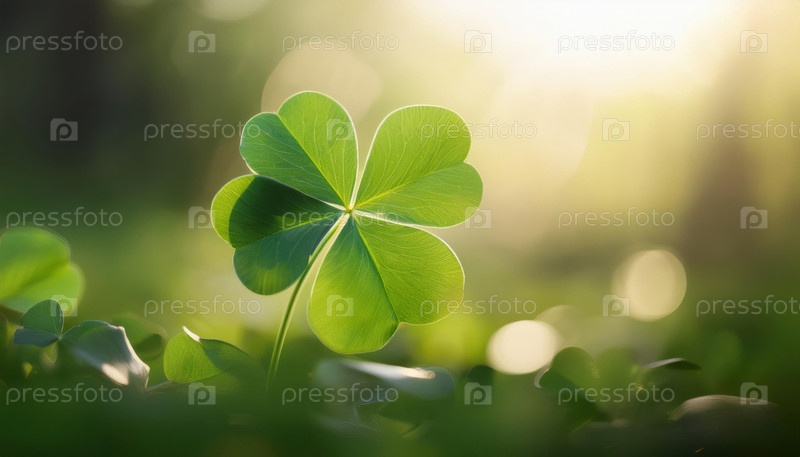 Близкий план четырехлистного клевера на солнце среди зеленых листьев, символизирующего удачу и красоту природы