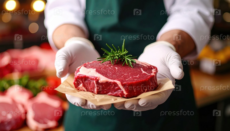 Мясник держит сырой стейк из розмарина, иллюстрирующий свежесть, кулинарную подготовку и связь между ремеслом и качественным источником мяса