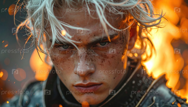 Фантастический воин с белыми волосами и интенсивным выражением лица, стоящий перед огнем и углими во время битвы