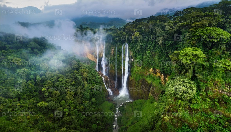 Величественные водопады каскад через плотные тропические скалы с туманом, отражая нетронутую природную красоту, тропических исследований и экотуризма направлений