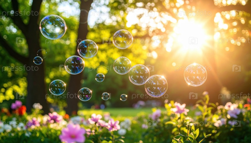 Пузыри плавают в солнечном саду, наполненном цветами, символизирующими радость, детские воспоминания, летние игры и эфемерную красоту природы