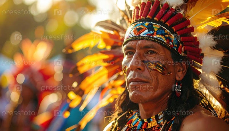 Коренный американец в традиционном платье с пернатым головным убором и украшениями на открытом воздухе