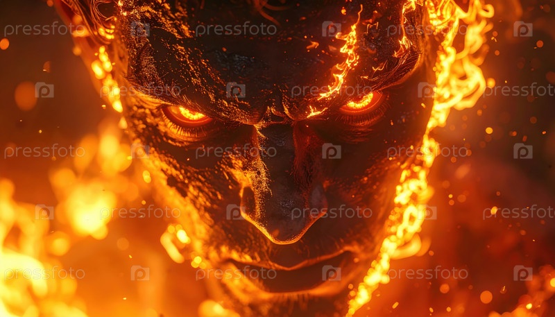 Огненный характер с сияющими глазами и расплавленной кожей, выходящей из пламени с интенсивным выражением