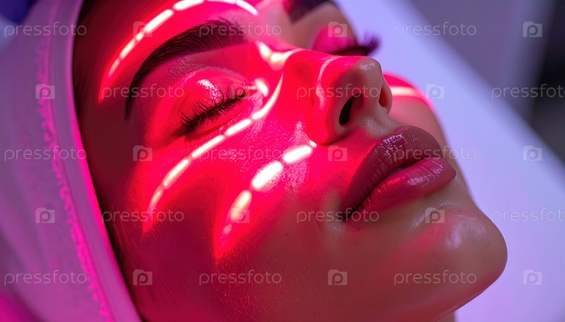 Женщина, получающая красный свет лицевой терапии светом для лечения кожи в косметическом спа