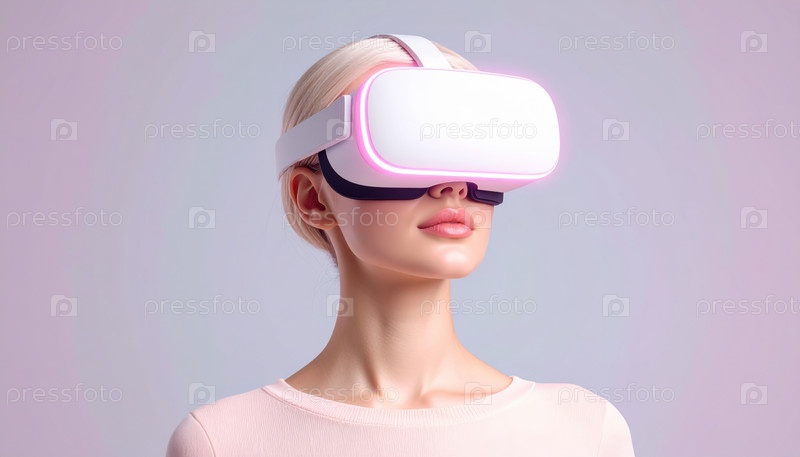 Женщина в футуристической VR-гарнитуре представляет инновации, опыт виртуальной реальности и захватывающее цифровое будущее на минимальном фоне