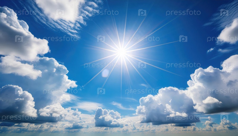 Яркое полуденное солнце светит сквозь пушистые кумулозные облака на ярко-синем небе со световым излучением, распространяющимся наружу