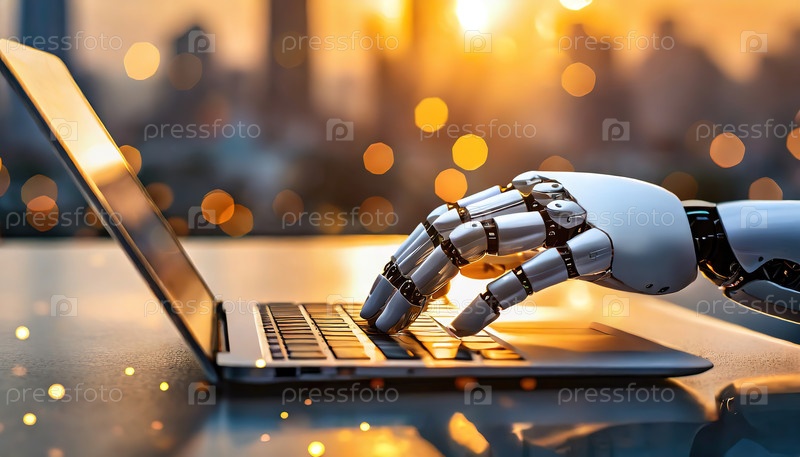 Роботизированное печать рукой на ноутбуке с городским горизонтом в фоне при закате