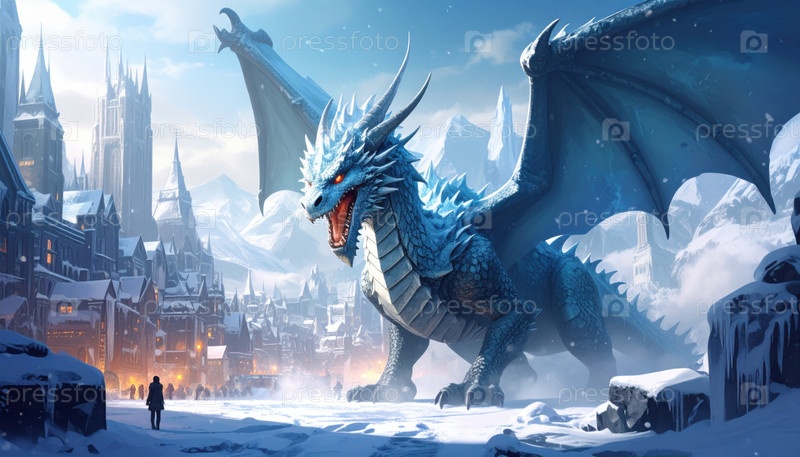 Ледяной дракон с синими чешуями, возвышающийся над заснеженным средневековым городом зимой