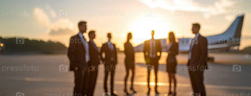 Группа бизнес-профессионалов стоит рядом с частным самолетом на закате, представляя корпоративный успех и роскошные путешествия