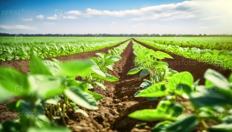 Широкое сельскохозяйственное поле с рядами молодых зеленых культур под ярким солнечным небом и облаками