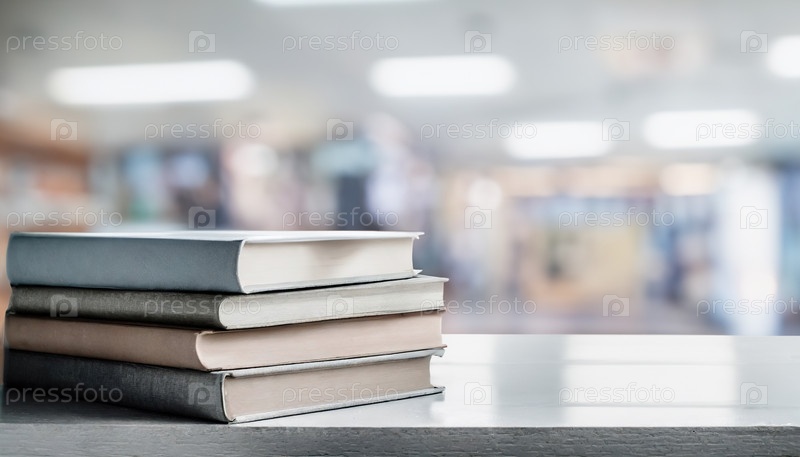 Куча книг в жесткой обложке на белом столе с размытым современным интерьером библиотеки или книжного магазина