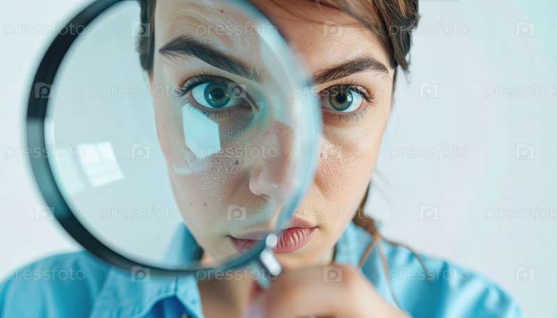 Молодая женщина смотрит на что-то через большую лупу, показывая любопытство и внимание к деталям