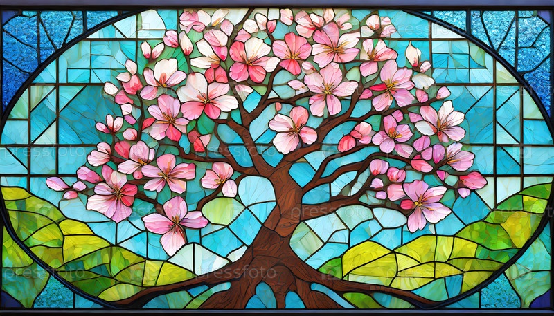 Искусство из витража, показывающее абстрактное цветущее вишневое дерево в полном цветении на синем и зеленом фоне