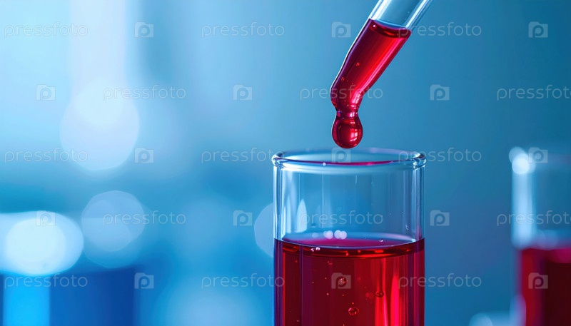 Капля красной жидкости, попадающей в пробирку, подчеркивает науку, медицину и эксперименты, представляющие собой инновации, биотехнологии или медицинский анализ
