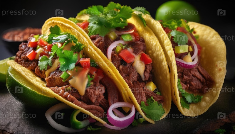 Три говяжьих тако в желтых кукурузных пирогах с кинжалом, лук, помидоры и расплавленный сыр