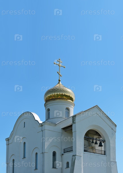 Православная церковь святых Адриана и Натальи в белом и золотом цветах, мемориал защитникам Ленинграда, современный чистый голубой фон неба