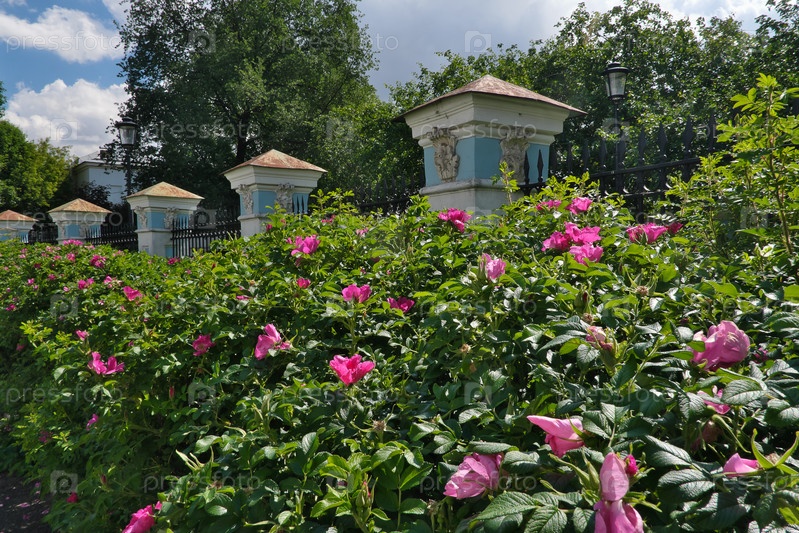 Санкт-Петербург, Россия, Николаевский морской собор.Летний вид цветущих розовых клумб возле забора