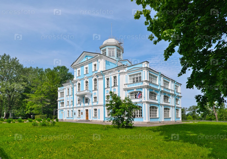 Особняк Воронцова (Особняк Новоznamenка, Санкт-Петербург), голубо-белый дворец в барокко стиле Треццини и Ринальди, летний вид с зеленой лугой