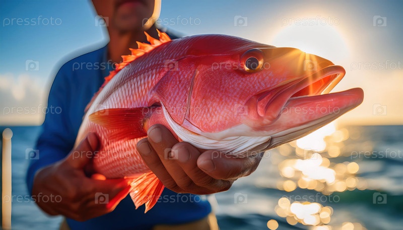 Рыбак держит недавно пойманное красное озеро на солнечном океаническом фоне, захватывая триумф и щедрость природы