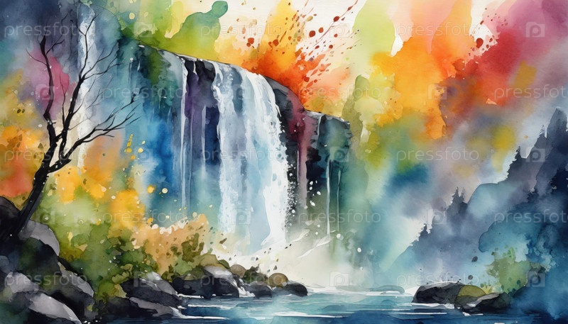 Акварельная живопись водопада, наполненного цветами, изображающая художественное представление природы и эмоциональное выражение через абстрактные пейзажи