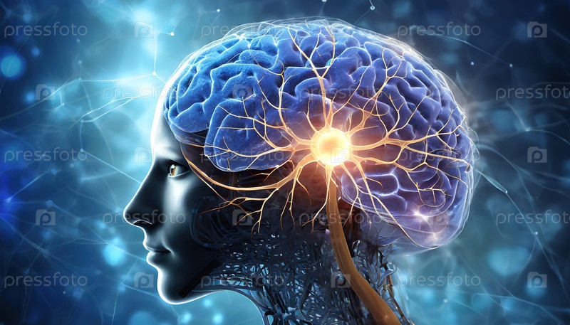 Цифровая иллюстрация человеческого мозга, освещенного нейронными соединениями и световыми импульсами в футуристическом стиле