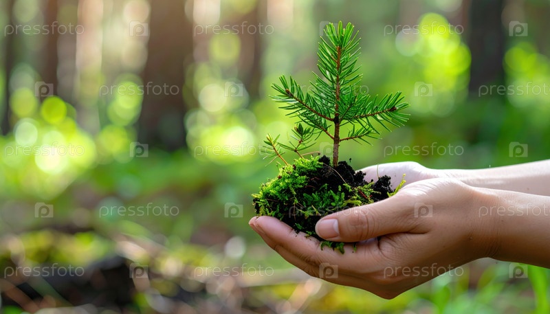 Руки, держащие молодые саженцы сосны с мхом в лесной среде во время усилий по лесовосстановлению