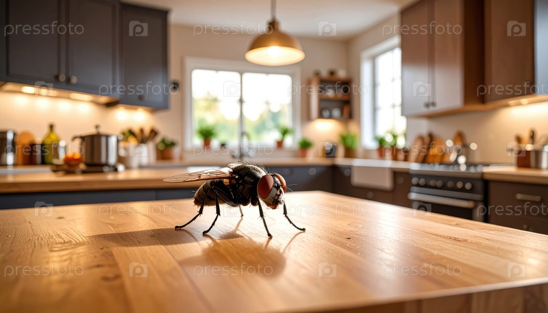 Гигантская домашняя муха на деревянной кухне, символизирующая риск загрязнения и важность гигиены в кухонных помещениях