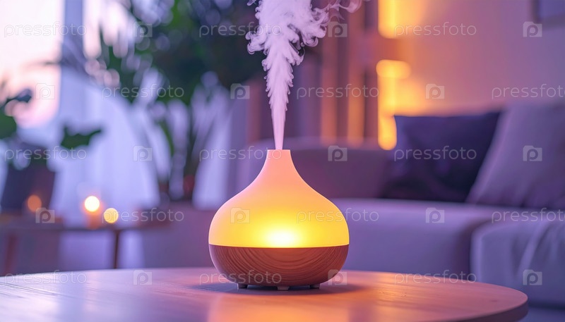 Современный интерьер дома с светящимся ароматическим диффузором, выпускающим пар в уютную атмосферу