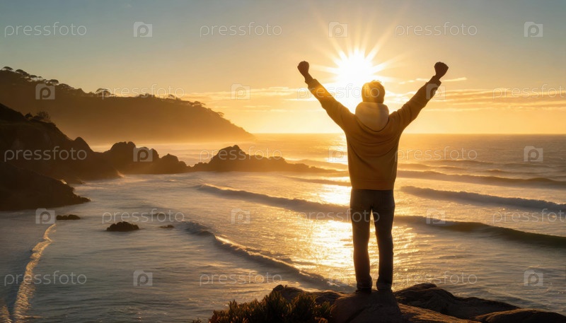 Человек поднимает руки в знак триумфа на скале с видом на океан на рассвете, празднуя успех