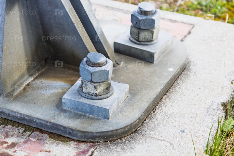 Закройте вид на тяжеловесные стальные болты и орехи, обеспечивающие промышленную металлическую раму для бетонной основы, демонстрируя прочную конструкцию и точные инженерные детали