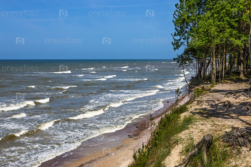 Красивое прибрежное побережье Балтии с бурным морем, песчаными пляжами и зелеными береговыми деревьями