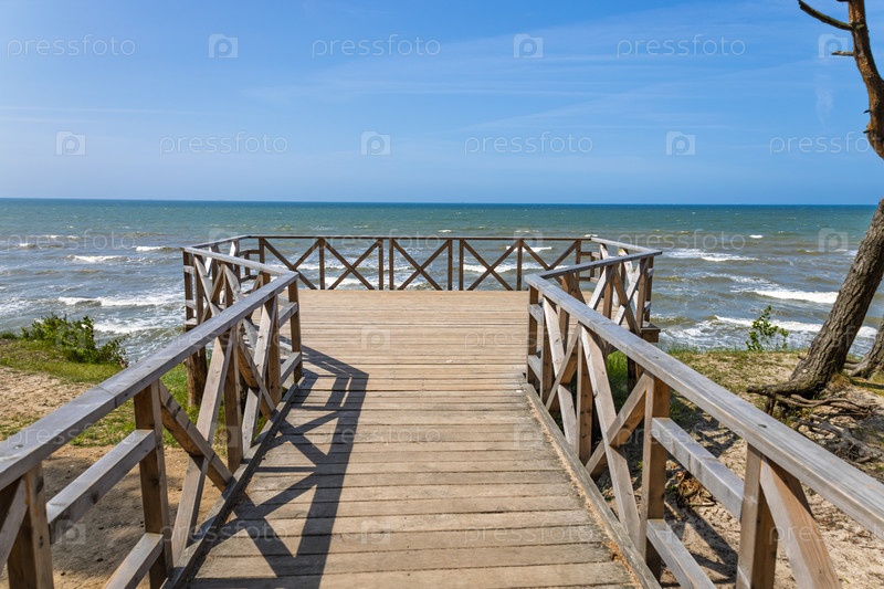 Деревянная набережная с деревенскими перилами ведет к возвышенной точке Балтийского моря над песчаными скалами и волнами