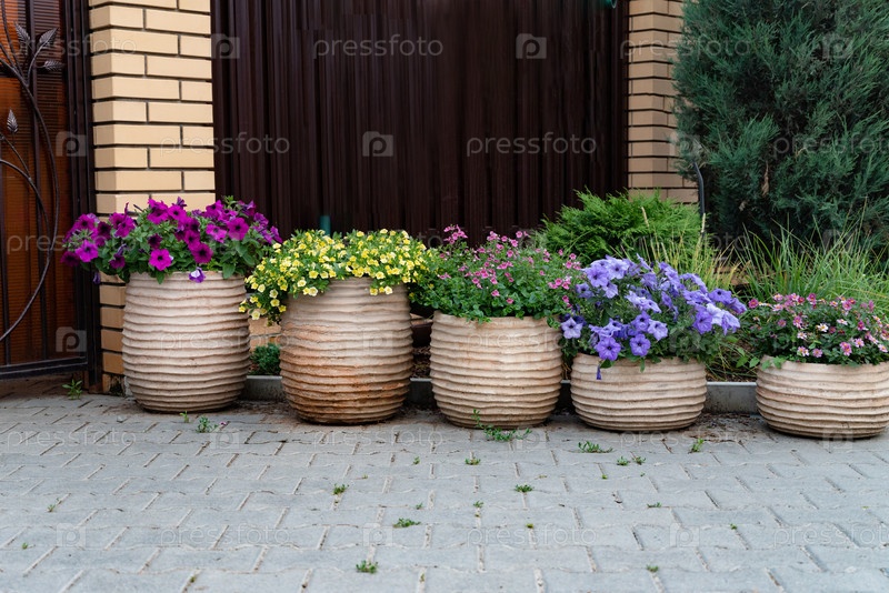 Яркие цветочные горшки украшают вход цветными цветами в жилом районе, демонстрируя красоту весны