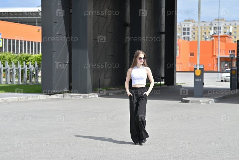 Женщина идет возле выдвижных ворот перед современным зданием
