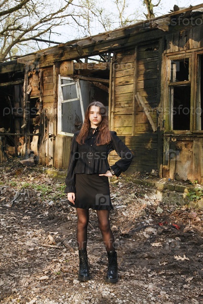 Молодая готическая девушка выходит из заброшенного дома в мрачный летний день