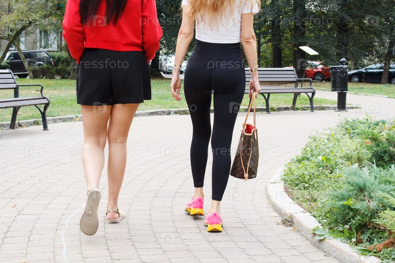 Девушки ходят по городской улице в летний день