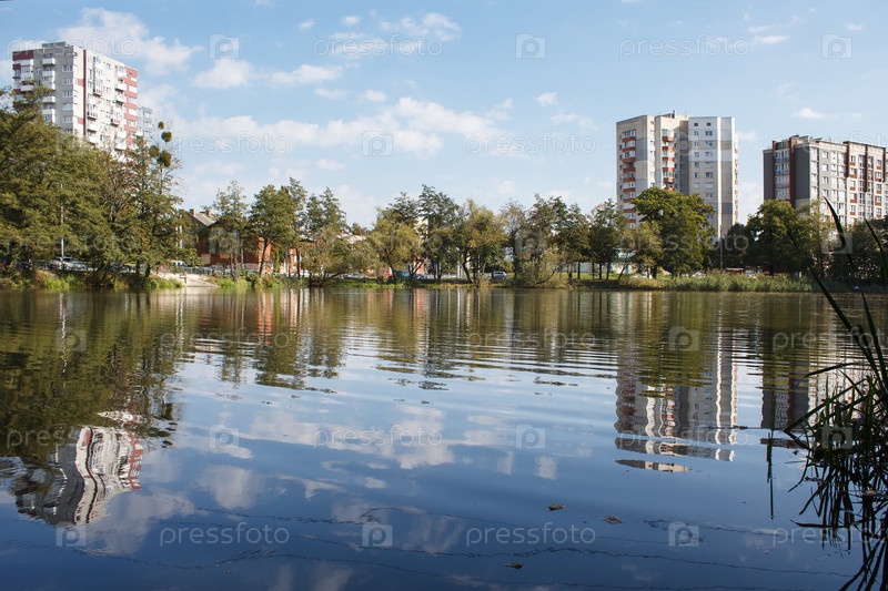 Городской пейзаж с рекой в России, солнечный летний день