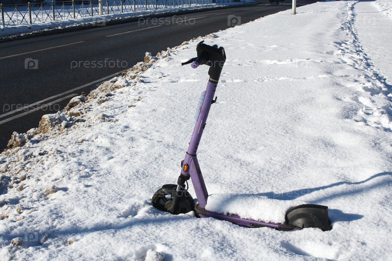 Арендуйте электрический скутер, покрытый снегом в солнечный зимний день