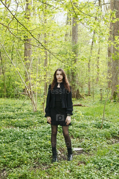 Молодая готическая девушка гуляет по лесу в мрачный летний день
